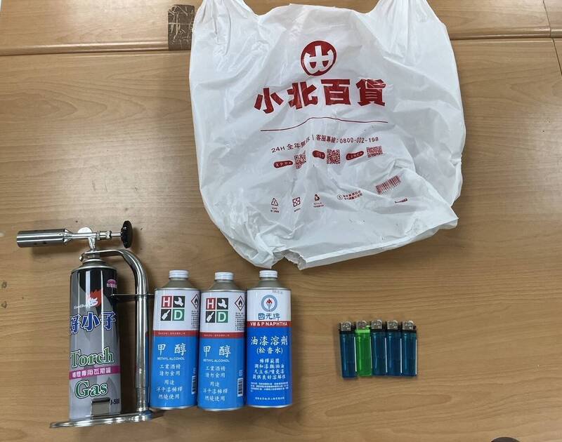 警方搜出瓦斯喷灯、酒精、松香水等证物。(记者姚岳宏翻摄)