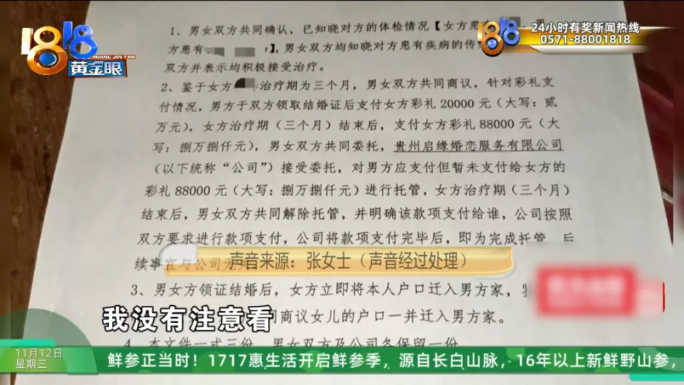 张女士:我从来没有去相亲过,第一次去相亲,我在那里面然后都是一片空白。彩礼还有一些没给,他们签那个合同,我没有注意看。