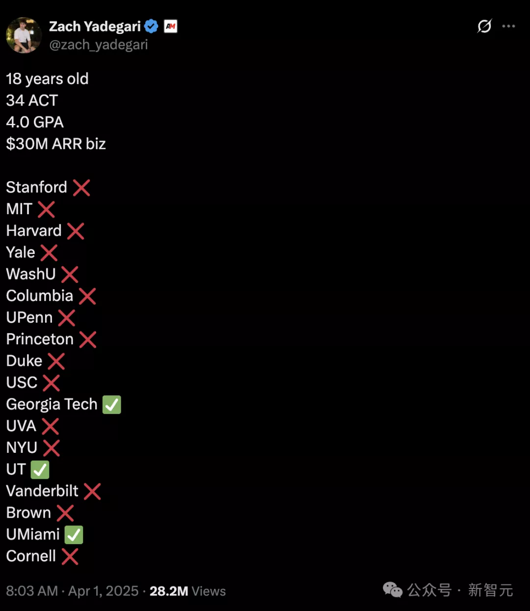 虽然拥有丰富的创业背景、GPA满分以及34分(接近满分)的ACT成绩,但Yadegari仍然收到超过十所常青藤盟校等知名学校的拒绝信,甚至连以“创业圣地”著称的斯坦福大学也未录取他。