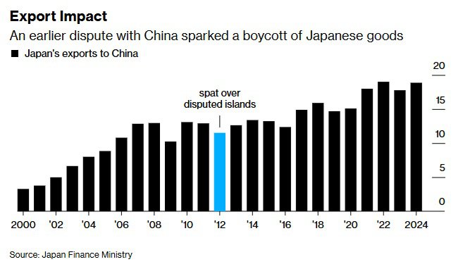 对东京而言,经济利害关系重大。中国是日本最大的贸易伙伴,而“玉渊潭天”的评论明确指出,日本制造商在关键材料上高度依赖从中国进口。早在2012年,中日因岛屿争端爆发的早期摩擦,就曾引发长达数月的日本商品抵制运动,对贸易造成影响。