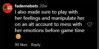 Vandersloot的月经时,他在评论区中写道:“我会故意玩弄她的感情,在比赛前用小号操纵她,扰乱她的情绪(来确保赌博成功)。”