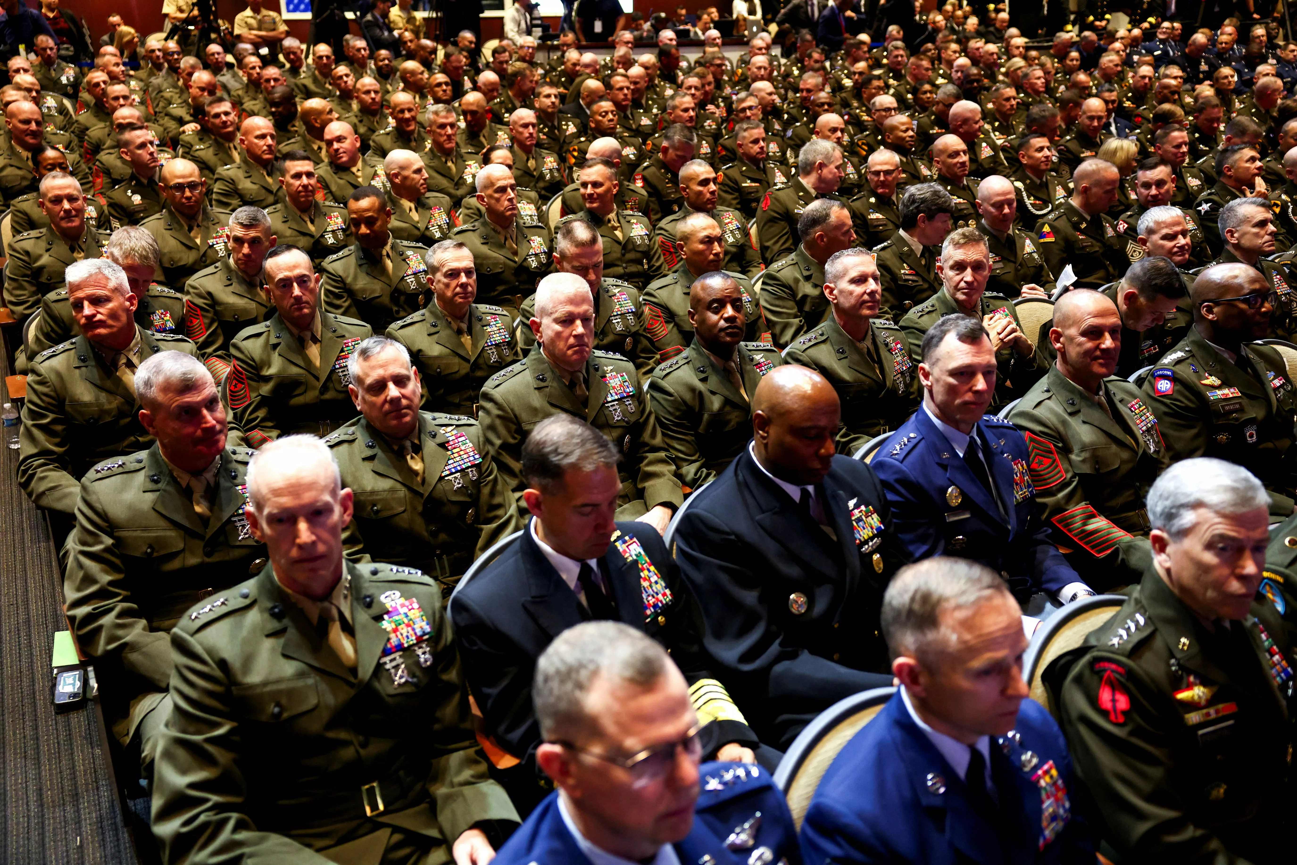 2025年9月30日,美国维珍尼亚州匡提科(Quantico)海军陆战队基地,美军将领参加由美国国防部长赫格塞思(Pete Hegseth,不在图中)召集的会议,等待美国总统特朗普(Donald Trump,又译川普,不在图中)发表演说。(Reuters)