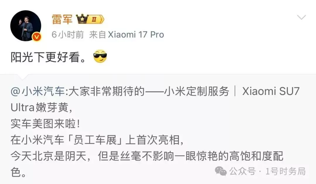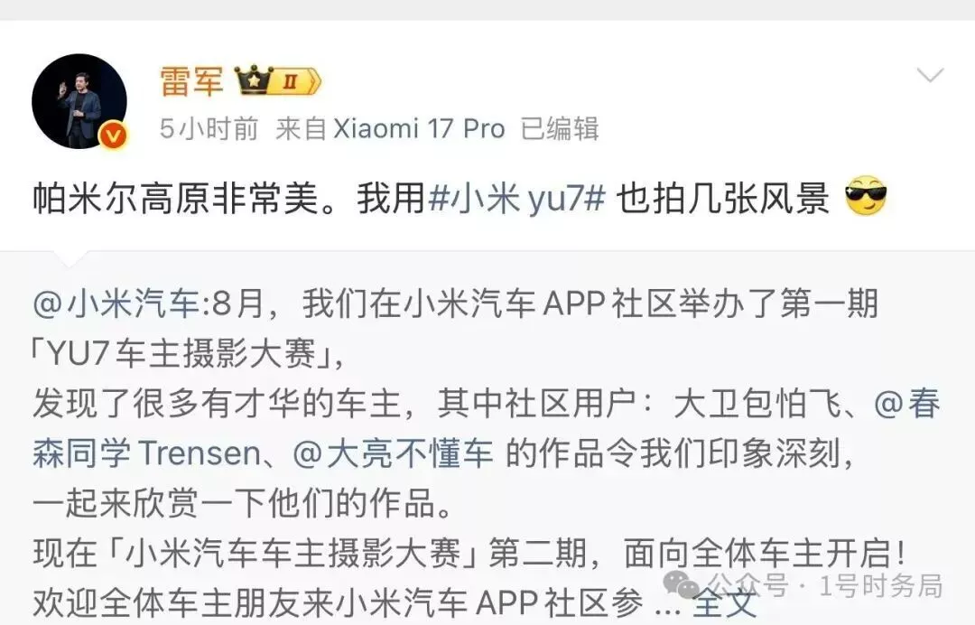 这与雷军同日发布的帕米尔高原美景和“阳光下更好看”形成了荒诞对照。