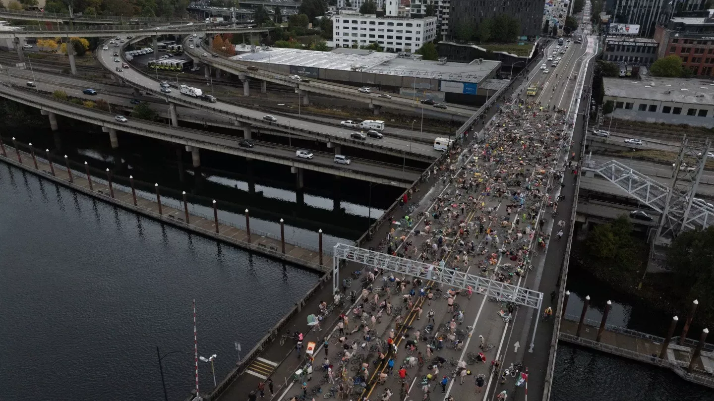 民众10月12日在奥勒冈州波特兰市参加裸骑单车活动,抗议川普试图派遣国民兵进驻该市镇压示威。(美联社)