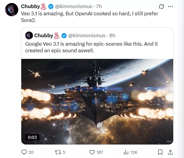 不过,AI领域创作者@kimmonismus则给予了“Veo 3.1令人惊艳”的评价,尽管他也认为OpenAI的最新模型在整体体验上仍略胜一筹。