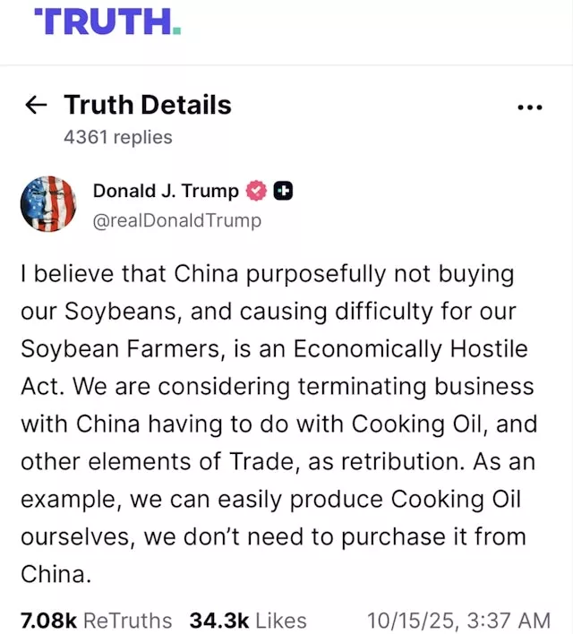 2025年10月14日,川普在其社交平台发表的一篇帖文中表示,中国“故意不购买我们的大豆,给我们的豆农制造困难”,这是在实施“经济敌对行为”。(realDonaldTrump@truthsocial)。