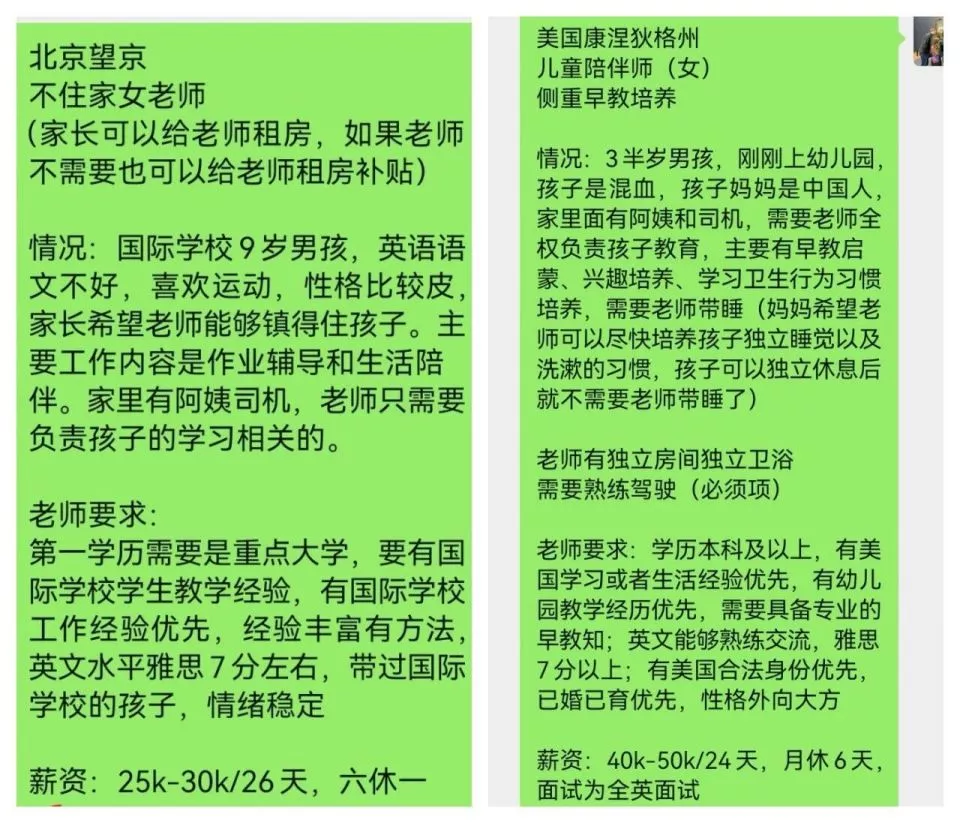 “月薪3-8万,国内985/211或海外名校毕业,包吃包住,负责儿童的高端陪伴与早教启蒙,英文好,最好有美术、音乐、户外高尔夫、骑马等特长……”