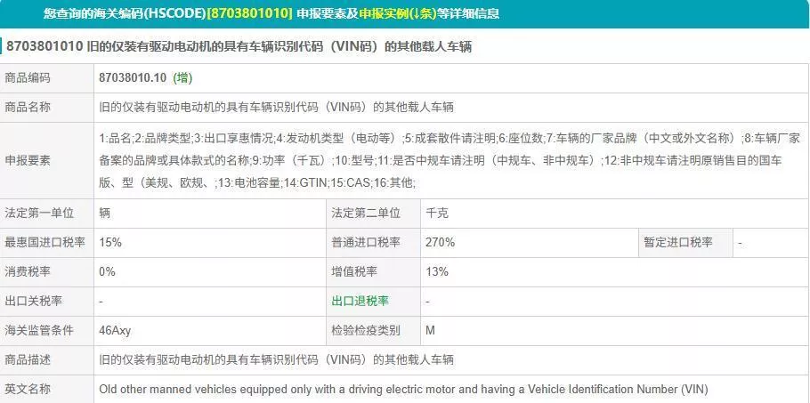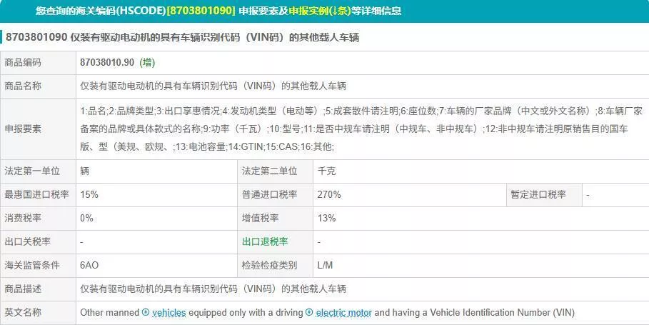 脖子哥翻阅了具体的海关编码,这次新增了具有识别代码的纯电车 (编码:87038010.90)