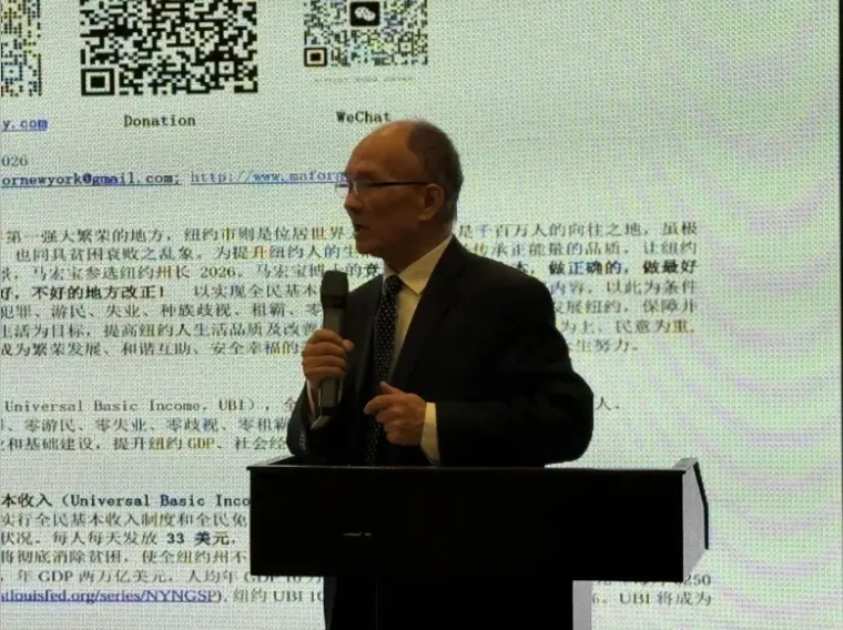 马宏宝在演讲中表示,他的参选不是为个人名利,而是希望“让纽约人过上更有尊严、更幸福的生活”。