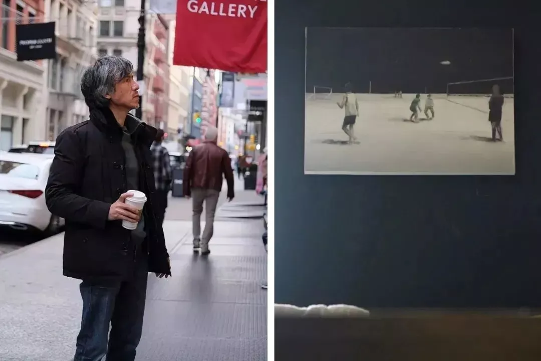 (左)在纽约街头;(右)李群力画作:Allen与儿子看世界盃。(一条)