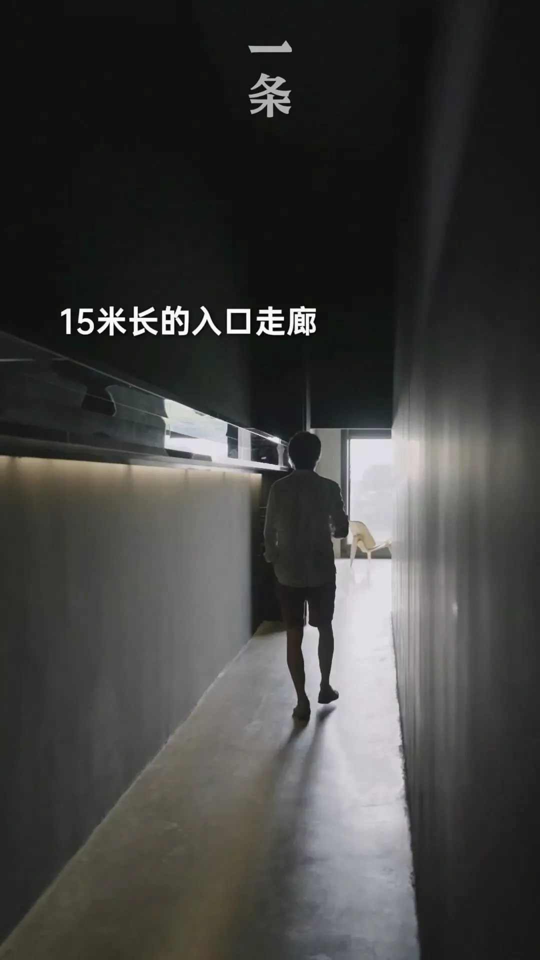这里就没有做成普通房子那样的白牆基底,而是一个很酷的黑房子,走廊很窄很长,像进门的入口走廊就有15米长。儘量不装门,连卫生间都没有门。走在里面有些曲径通幽。客厅层高8米。整个房子改变最大的就是客厅的窗,把两道非承重牆打掉之后,装了3块大玻璃,视野开阔。窗框是天然的画框。每天望出去,都能看到日落、日出、阴晴的变化,四时景緻不同的农田是这幅自然画卷里永远的主角。
