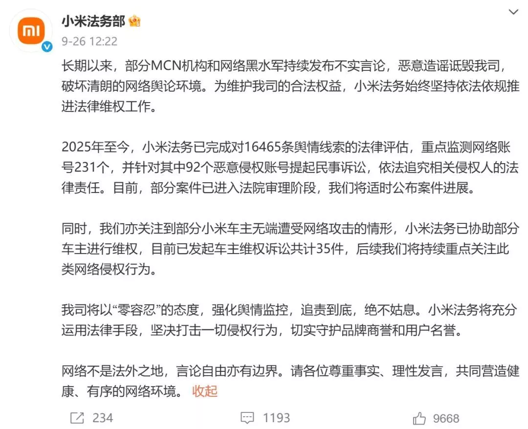 最近风口浪尖上的小米汽车通过法务部发表声明,要坚决打击黑公关和网络水军。