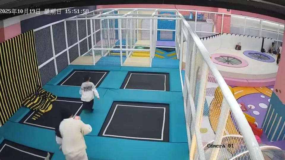 有网友发布的事发时游乐场内的监控录像显示,10月19日下午3时49分,两名孩子在蹦床游乐区内追逐玩闹。下午3时51分,绿衣儿童在玩耍过程中突然靠倒坐下,然后起身后踉跄走至一游乐设施后方。白衣儿童见状,跑去查看情况。
