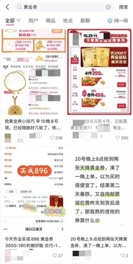 电商的优惠机制精准击中了“攒金人”群体的消费心理:他们不仅追求资产的保值属性,也极力寻求购金的“性价比”,力图以接近甚至低于大盘的克价购入黄金饰品。在这一目标驱动下,全网比价、抢券凑满减,已成为他们购金过程中不可或缺的一环。