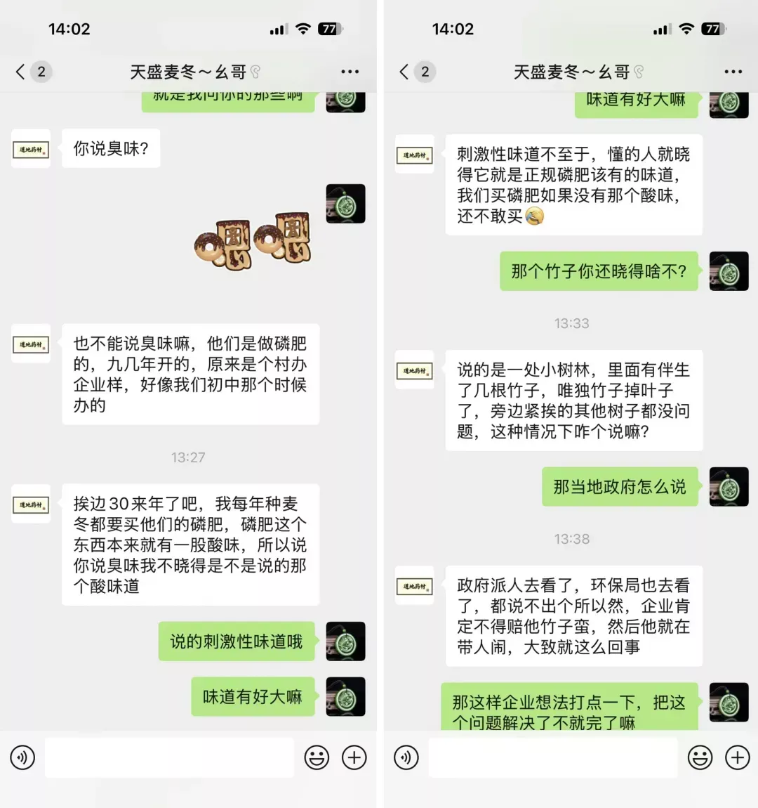 当群主质疑工厂排出的“刺激性味道”时,“AZ”再次抛出与“幺哥”的对话截图。这位“幺哥”给出了一套听起来颇为“专业”的解释。他声称,磷肥厂的味道并非臭味,而是“正规磷肥该有的味道”,甚至说“我们买磷肥如果没有那个酸味,还不敢买”。至于竹子落叶,他也解释为“一处小树林,里面有伴生了几根竹子,唯独竹子掉叶子了,旁边紧挨的其他树子都没问题”,暗示这与工厂无关。