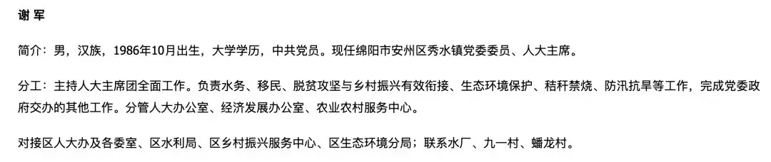 调查的突破口就在这个被隐藏的名字里。在搜索引擎中输入“绵阳市安州区秀水镇谢军”,一个令人震惊的身份浮出水面。搜索结果显示,谢军,正是绵阳市安州区秀水镇的现任党委委员、人大主席。更具讽刺意味的是,根据政府官网的公开分工,谢军主席负责的工作中,赫然列着“生态环境保护”。