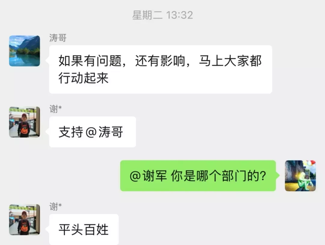 10月21日下午。在“涛哥”分享了“朝阳大集体”微信群的和谐截图,谢军也附和说“问题得到解决了就对了”之后,群主决定不再进行迂回的试探。他直接在群里引用了谢军的话,然后发出了灵魂一问: