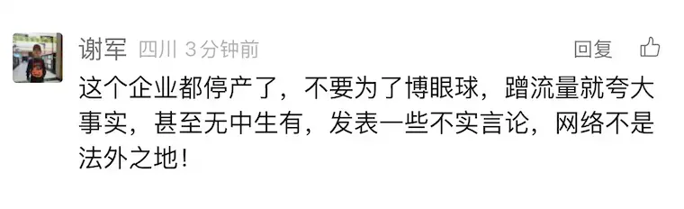 如果说“涛哥”扮演的是温和的引导者,那么“谢军”则是不加掩饰的“维稳”执行者。他的第一次亮相就充满了官方的威慑力。在文章评论区,他措辞严厉地指责作者:“这个企业都停产了,不要为了博眼球,蹭流量就夸大事实,甚至无中生有,发表一些不实言论,网络不是法外之地!”。这番话不像普通网民的质疑,更像是一份官方训诫。