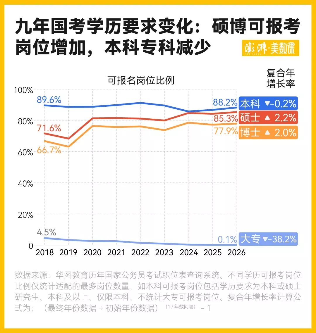 近九年国考的另一个明显趋势是,学历门槛略有提高。硕士、博士可报考岗位在过去九年的年复合增长率分别为2.2%和2%,均有小幅提升。