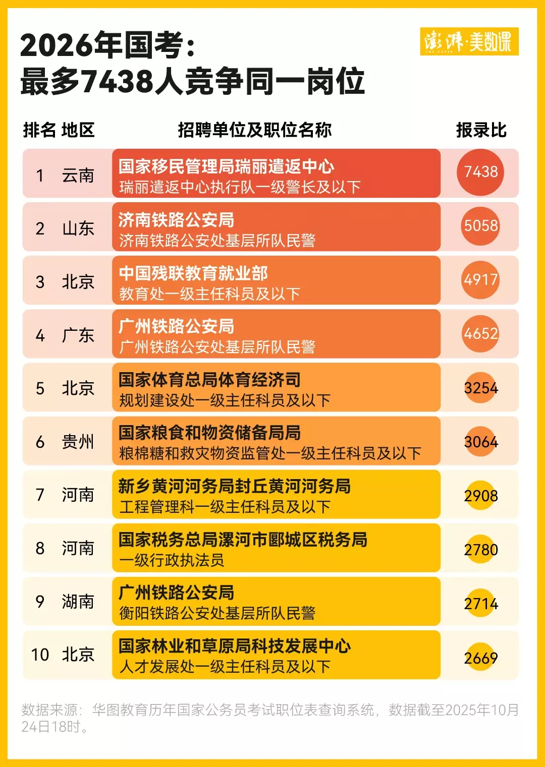 报录比最高、竞争最激烈的岗位是历年国考报名的关注焦点。华图教育数据显示,2026年国考竞争最激烈岗位是“瑞丽遣返中心执行队一级警长及以下”,报录比为7438:1。其他上榜今年十大热门岗位的还有来自公安局、残联、体育局、税务局等部门的岗位。