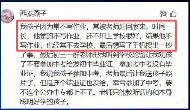 更有像“西秦燕子”这样的家长,用亲身经历哭诉:“孩子常被老师赶回家,时间一长,他觉得不写作业还能不上学,真好。”一个看似立竿见影的惩罚,却意外地将孩子推向了更深的厌学深渊。老师的初衷或许是“震慑”,但实际传达给孩子的信号却是:学校,是一个可以凭借“变坏”就能轻易离开的地方。