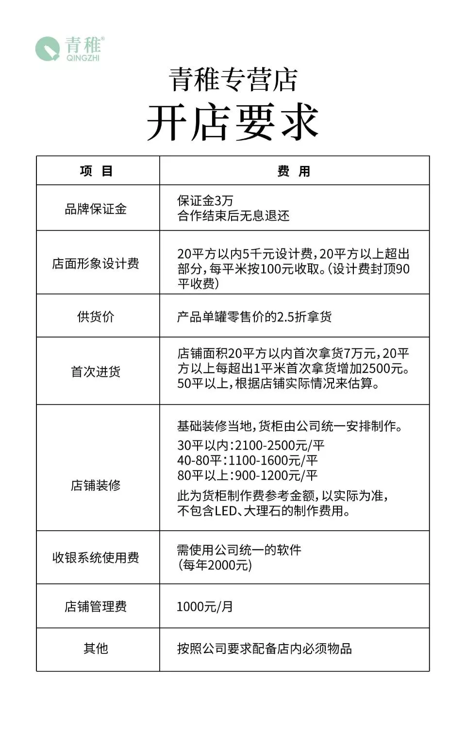 青稚要求,选择店铺时,选择在客流量较大的景区、步行街等,建议面积40平及40平以上,门宽5至6米的双门面双门头的店铺(也就是传统意义上的旺铺)。