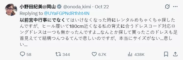 她并回忆2024年11月国会开幕典礼时的经验,写道:“那时为了出席宫中行事,疯狂寻找可租借的礼服,但对我这种穿上高跟鞋就近180公分的身高来说,符合规范的长礼服竟一件都没有。最后好不容易找到并买下这件,但脚踝仍会露出、穿起来相当紧绷,真的很难过。”