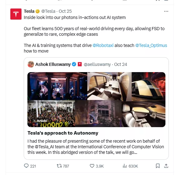 根据特斯拉AI负责人Ashok Elluswamy的介绍和官方发布的演示,该模拟器是一个完全由神经网络构成的“孪生世界”。它能够基于真实世界的海量数据,以极高的保真度生成连续、多视角的虚拟驾驶场景。特斯拉称,通过这种方式,其AI系统能在一天之内学习相当于人类500年驾驶时长的经验。