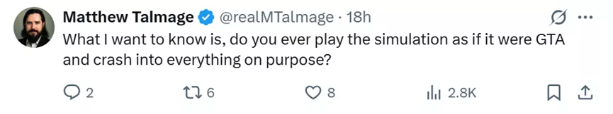 然而,这一战略路径也引发了新的市场讨论和投资者的疑虑。根据X上部分网友的评论,一些观点认为,如果模拟技术发展到可以高度替代真实世界数据,理论上竞争对手无需拥有庞大的车队,也能通过模拟足够多的场景来追赶特斯拉。
