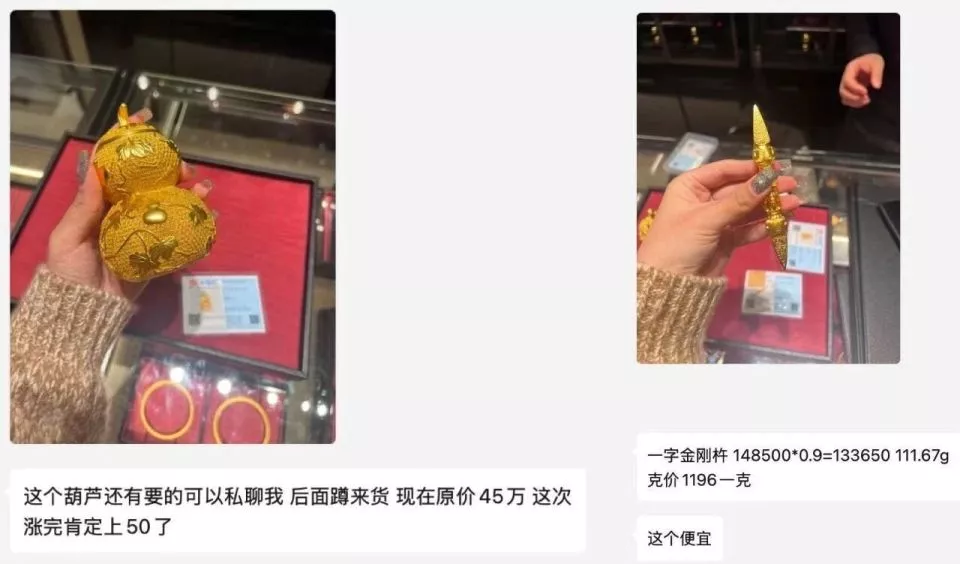 袁佳进了一个老铺黄金的代购群,不管群主发啥,最终都被一抢而空。一个手掌大的金色爬藤葫芦,300多克,原价45万,竟然很快就被人买走,只是因为代购强调的一句:「涨完价肯定就上50万了。」