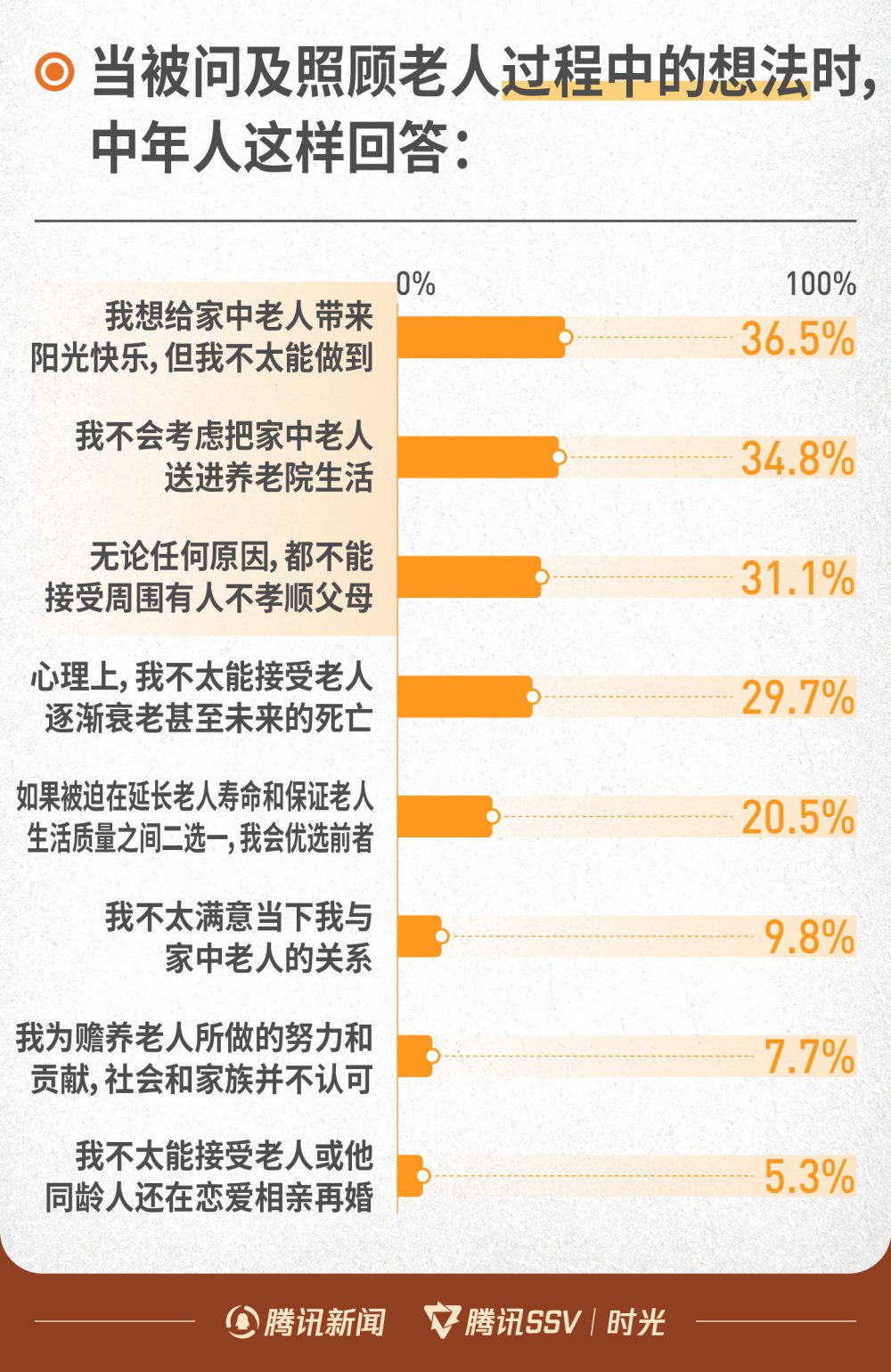 照顾老人的路充满不易,但坚韧的中年人勇于面对与承担:和老年人的立场相似,照顾老人的中年人,也有相当一部分“不考虑将家中老人送养老院”。而在这种照顾和陪伴中,往往带有些心情上的灰色,“我很想、但不太能做到给老人带来阳光和快乐”。