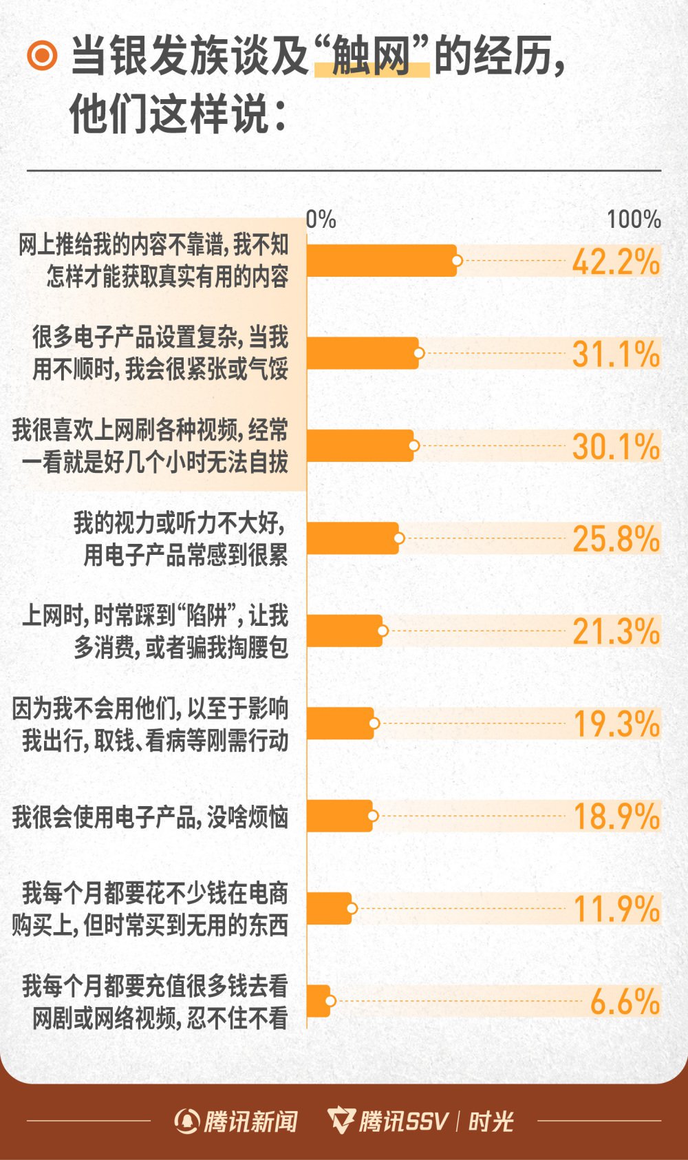 智能手机普及了,但“触网”对60岁以上人士来说,并不总是美好的体验。42.2%的受访者因 “网上内容不靠谱,不知如何获取真实有用信息” 而困扰,成为最突出的问题;其次,31.1%的老人因 “电子产品设置复杂,用不顺时会紧张或气馁”,30.1%人 “喜欢上网刷视频,常一看数小时无法自拔”。假内容太多、用不顺、沉迷问题、消费踩坑是银发族在“冲浪”时最常遇到的不愉快。而听力、视力、反应速度的下降,也是常见困扰。