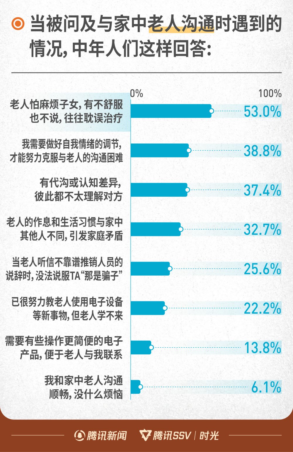 与父母沟通,远非想象中那般其乐融融。最大的痛点在于:超半数受访的中年人发现,老人怕麻烦子女,身体不舒服也忍着不说,往往耽误病情。此外代沟、认知及生活习惯的差异也是集中困扰。仅有 6.1% 的人认为沟通顺畅无烦恼。