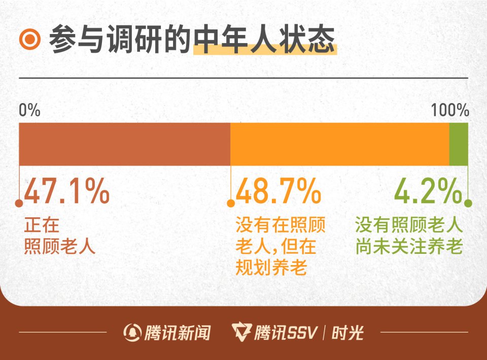 在参与调研的中年人中,47.1%正在照顾老人,48.7%虽未照顾老人但已在规划自身养老,两者合计占比超九成;仅 4.2% 的中年人既未照顾老人,也尚未关注养老。这表明绝大多数中年人已深度卷入养老事务,或在为自身养老未雨绸缪。