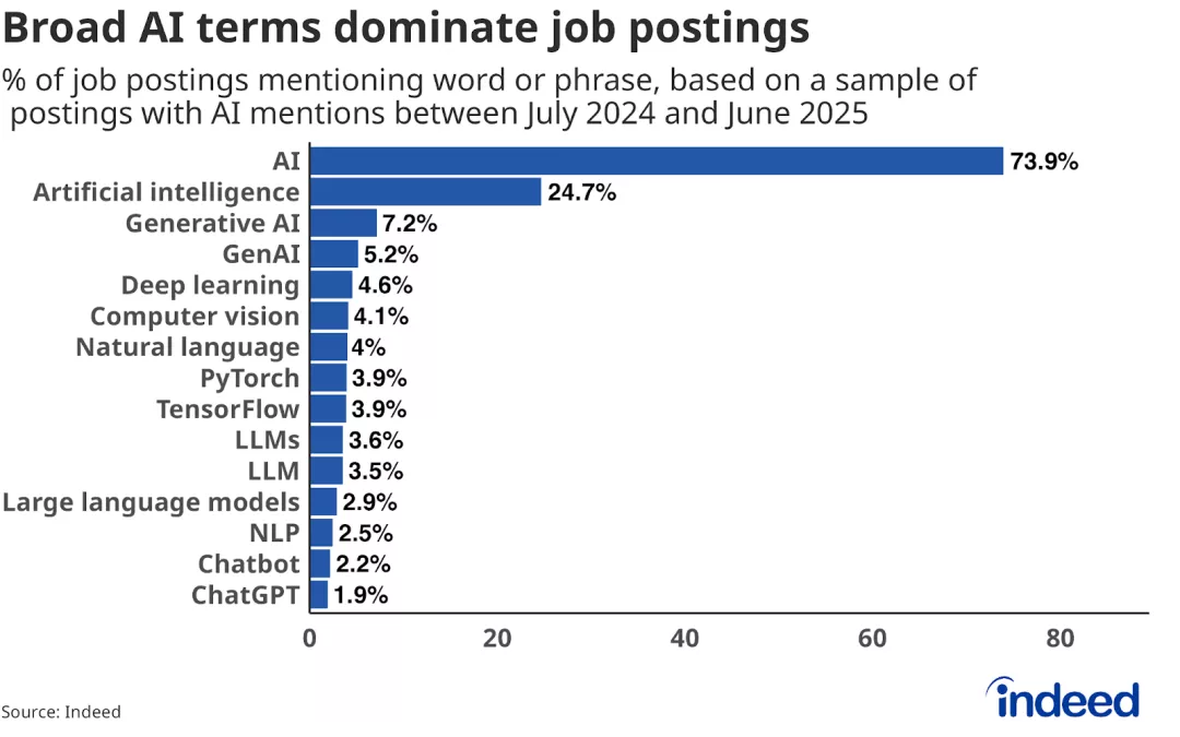 2024 年 7 月至 2025 年 6 月,人工智能相关职位招聘信息中最常用的 15 个关键词,AI 占主要地位,而不是某项具体 AI 技能,如计算机视觉、自然语言处理等