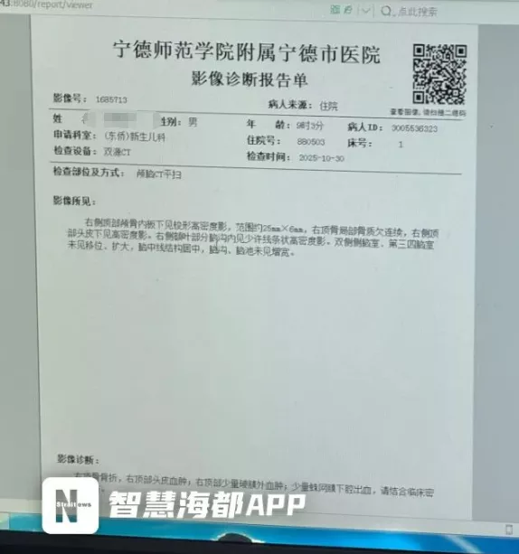 福建宁德一新生儿从医院推车坠落,致右顶骨骨折