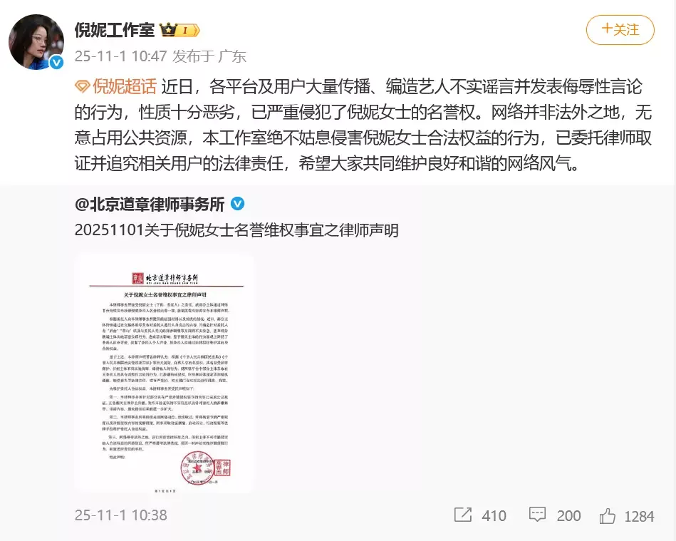 11月1日,倪妮工作室委托律师发布声明:近日,各平台及用户大量传播、编造艺人不实谣言并发表侮辱性言论的行为,性质十分恶劣,已严重侵犯了倪妮女士的名誉权。网络并非法外之地,无意占用公共资源,本工作室绝不姑息侵害倪妮女士合法权益的行为,已委托律师取证并追究相关用户的法律责任,希望大家共同维护良好和谐的网络风气。
