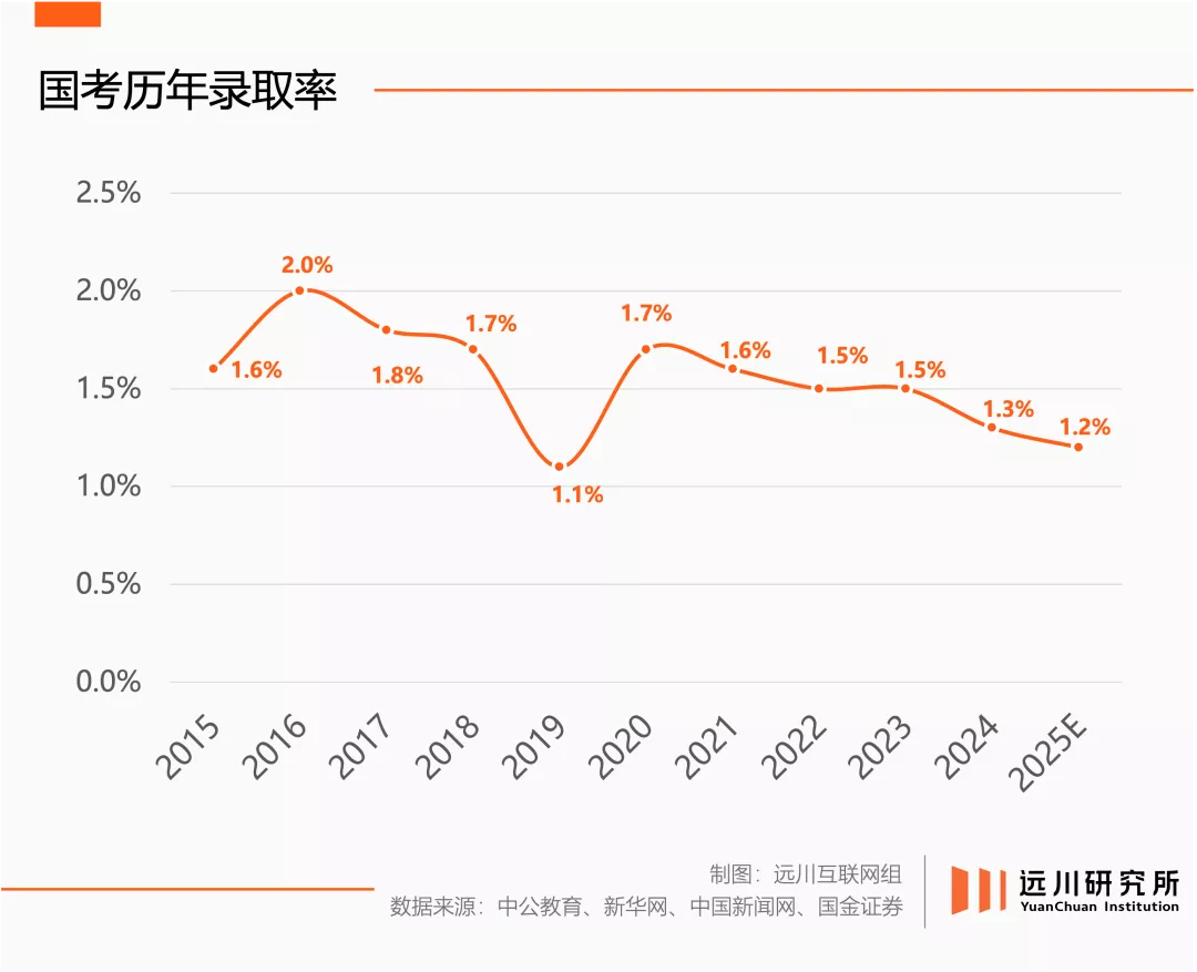 考公市场越火热,中公教育越痛苦。以国考为例,2021年至2024年,国考报名人数翻了近一倍,录取率却从1.6%变成了1.3%,坑位的增速远远落后于萝卜的长势。
