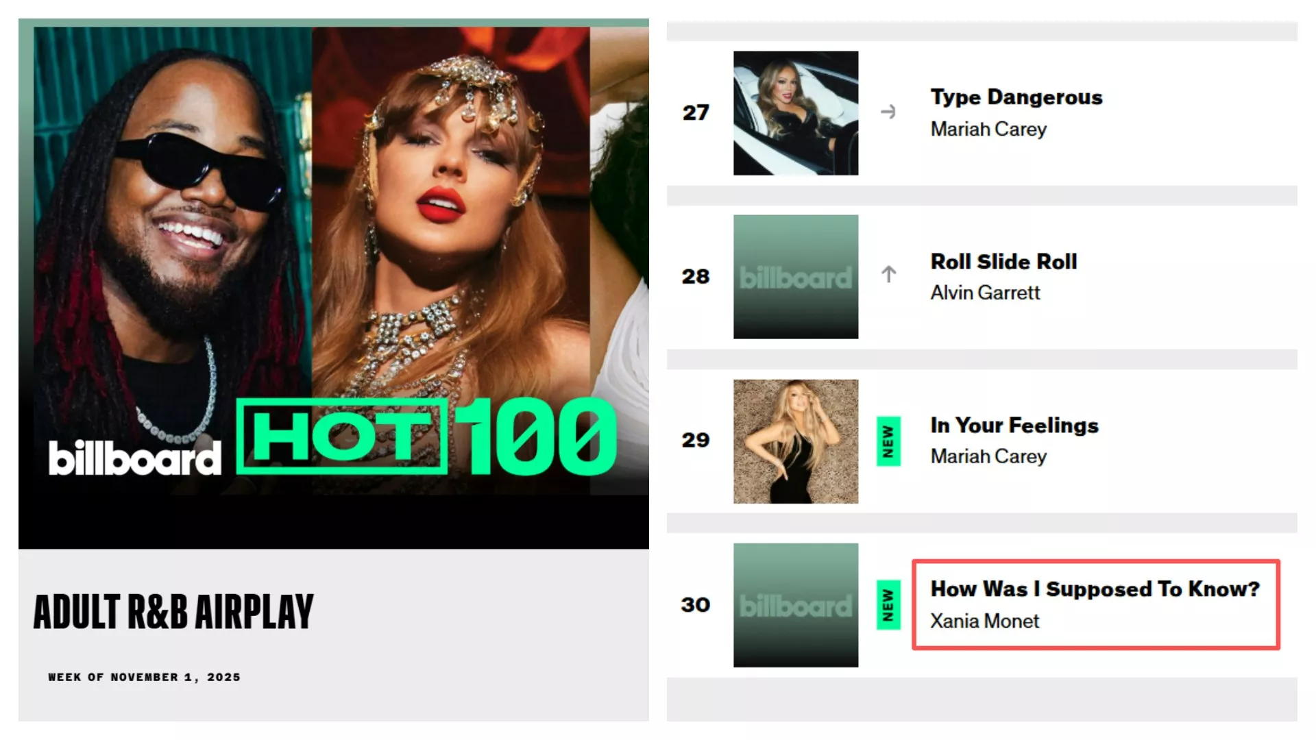 图为美国告示牌2025年11月1日公布的本周成人R&B电台排行榜的榜单拼图,左图为榜单首页,右图为AI歌手Xania Monet的歌曲名列第30。(Billboard)