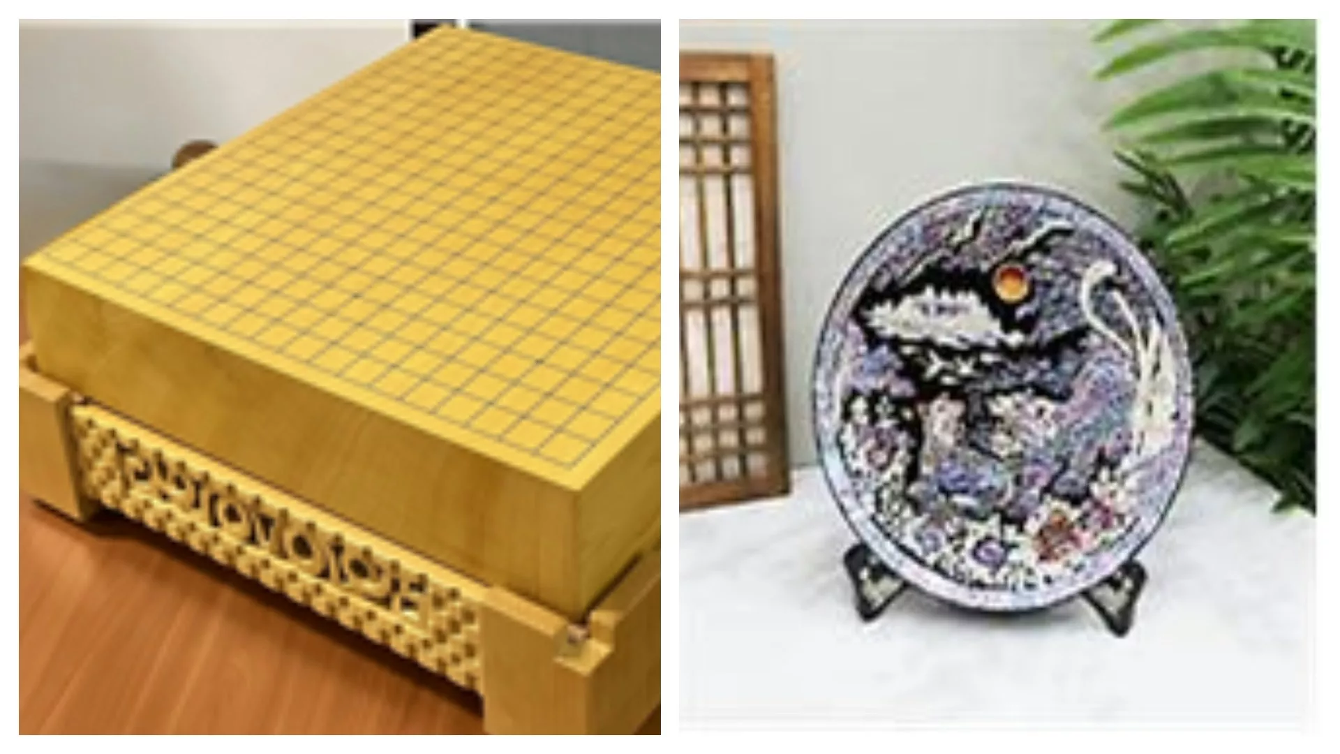 2025年11月1日,韩国庆州,图为李在明赠送习近平的两件礼物的拼图,左图为榧树围棋盘,右图为螺钿漆器圆形托盘。(韩国总统府)