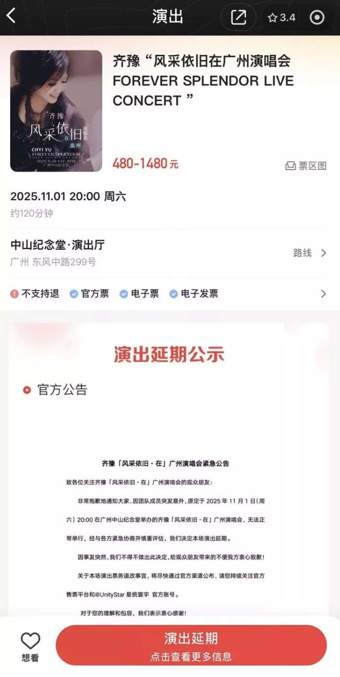 齐豫广州场演唱会也紧急发布公告宣告演出延期。(截图)