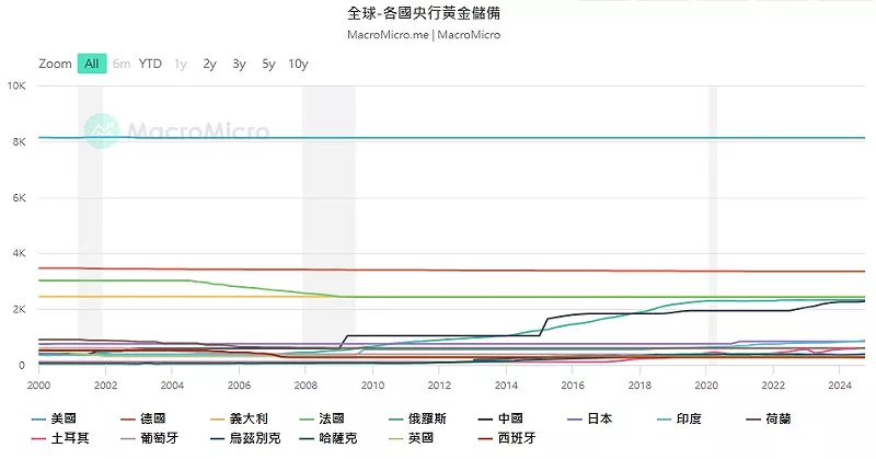 全球央行储备黄金走势图。 图: 撷取自财经M平方(macromicro.me)