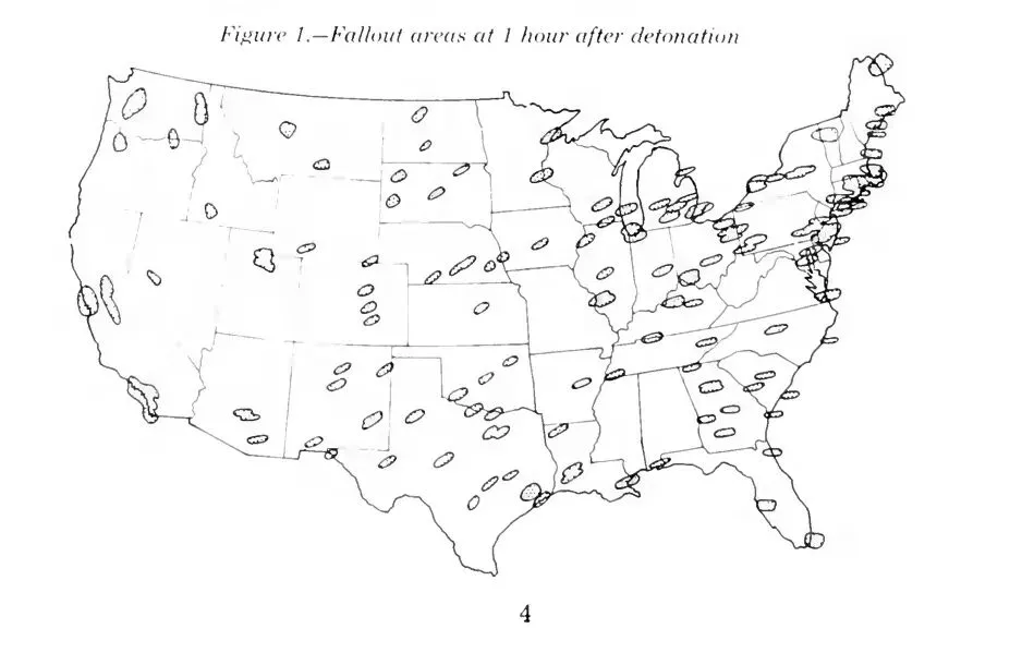 为了提醒美国民众不把核威胁视作儿戏,指南开宗明义地指出了美国本土容易被打击的目标,并贴心地推导了核战争对普通民众的影响——根据气象预测,巨量的核辐射和尘埃将在行星风系的吹拂下,仅用24小时覆盖美国全境。