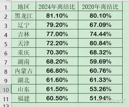 再看离婚数据,下面是2024年离结比排名前十的省份: