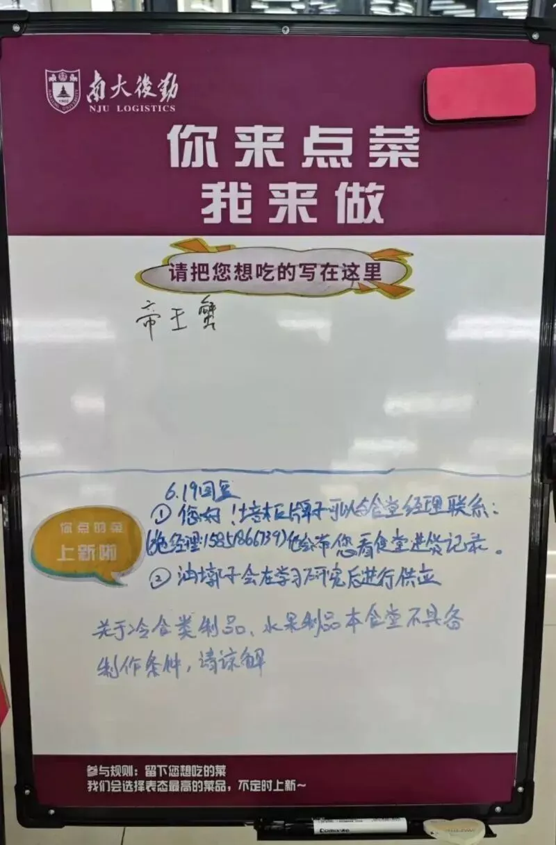 今年4月,南大食堂曾推出“你来点菜我来做”活动,有学生在留言板留下了一句玩笑的“我想吃帝王蟹”。尽管相关负责人澄清,此次帝王蟹供应并非回应当时的“许愿”,但也体现了高校后勤尝试创新服务、离学生更近的一贯努力。