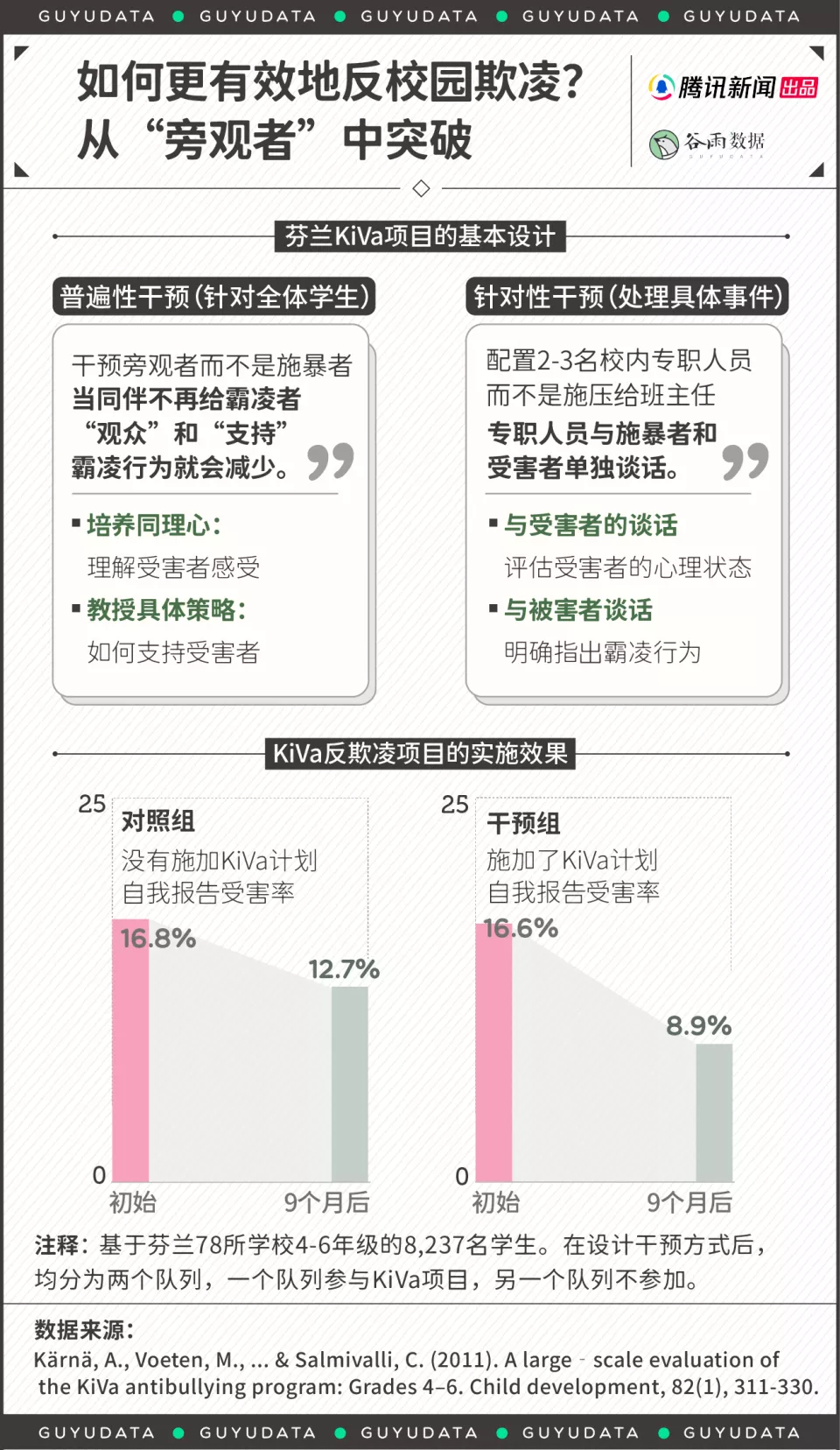 在北欧,芬兰用一个叫KiVa的项目,让校园欺凌事件大幅下降。根据当地基于78所学校、8237名4-6年级学生的大规模评估结果,实施KiVa项目9个月后,干预组的自我报告受害率从16.6%降至8.9%,下降幅度接近50%。而对照组仅从16.8%降至12.7%。