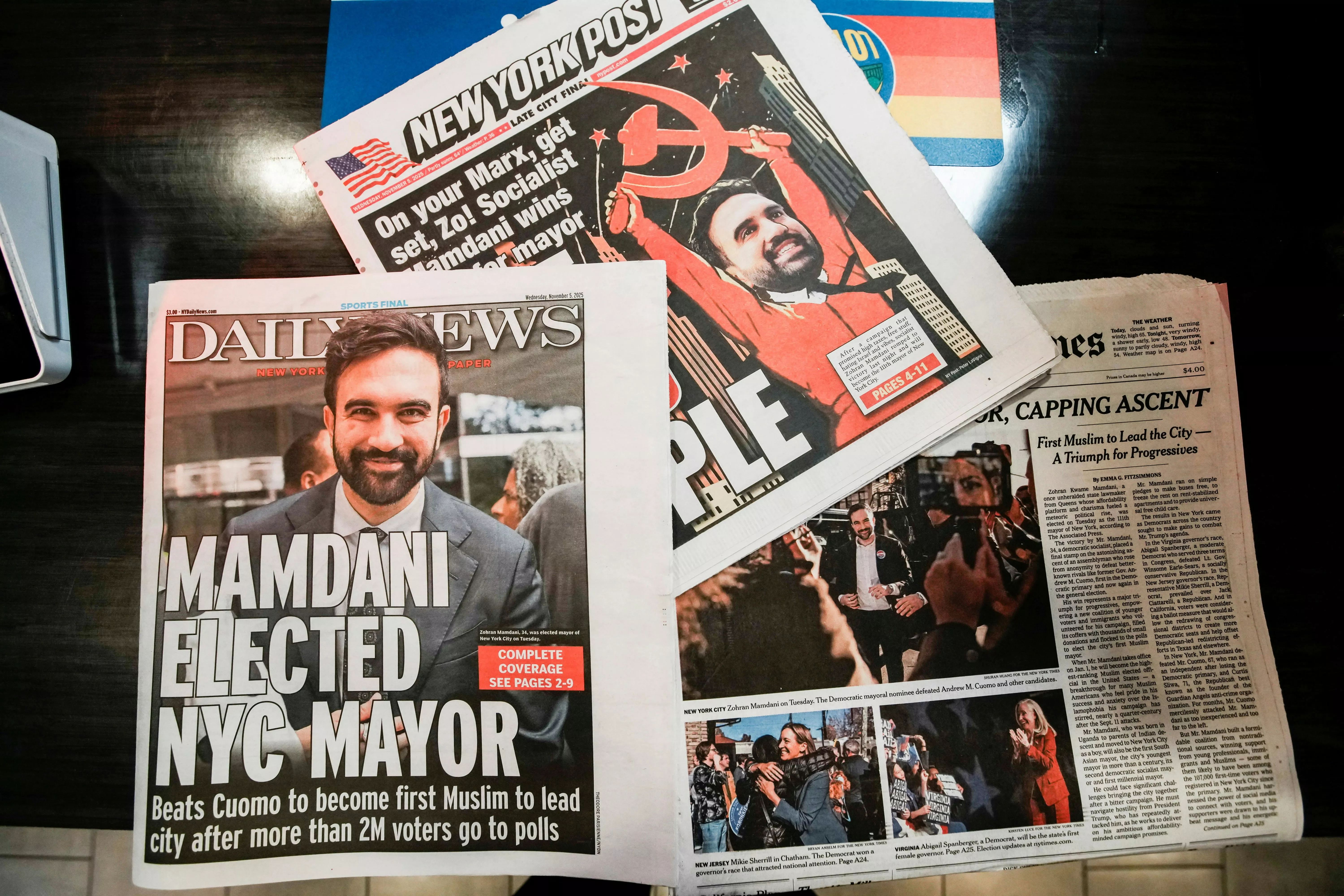 2025年11月5日,美国纽约市选举日后的第二天早上,《每日新闻》和《纽约邮报》报导了佐兰·马姆达尼(Zohran Mamdani)赢得市长选举的故事。(Reuters)