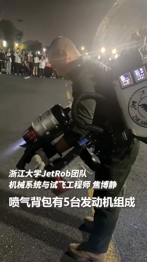 这项由浙江大学团队研发的创新科技,让穿戴者宛如电影中的钢铁人,能够腾空而起并在高空完成各种动作。(微博@共青团中央)