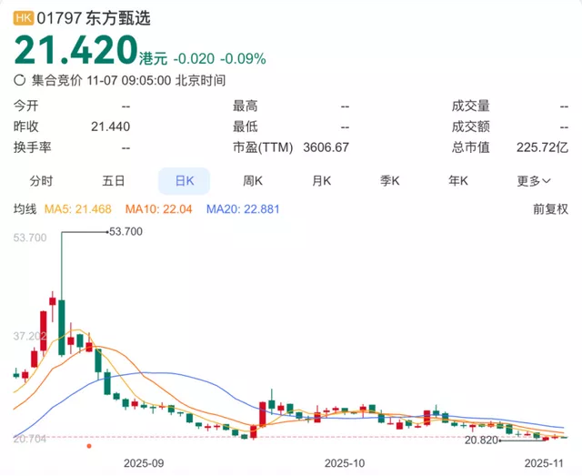 虽然在孙东旭主导下,东方甄选构建了一套稳固的公司治理体系,产品模式也得到了市场验证。但是其股价并未完全回到最鼎盛时期,巅峰时期,东方甄选股价76港元/股,而截至11月6日收盘,东方甄选股价再次下滑至21港元/股。