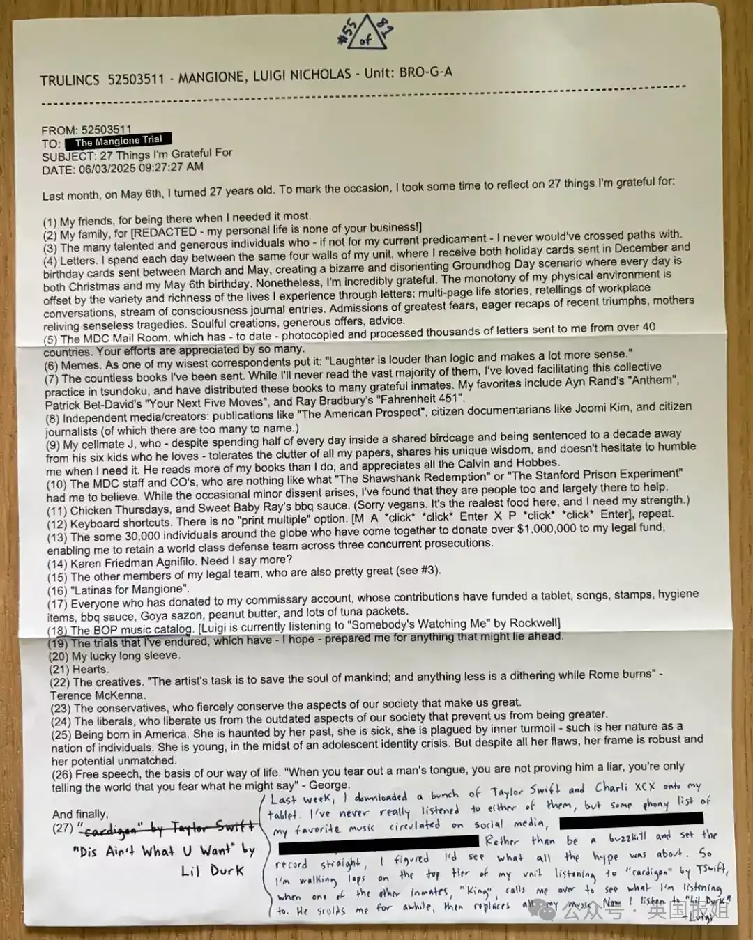 享受到特殊待遇的路易吉,在狱中心情甚好,他会时不时给自己的粉丝们回信,讲述自己的近况。
